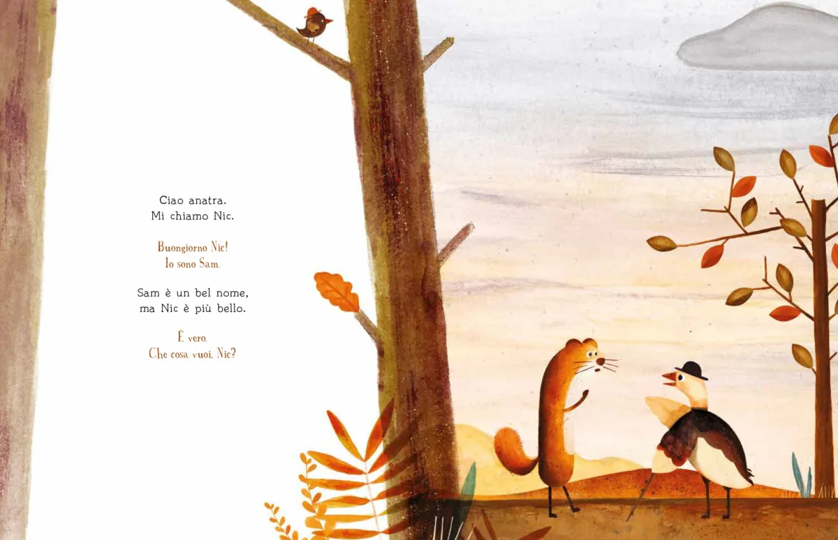 La donnola Nic è molto triste: la sua adorata compagna, Mira, è partita. Se n’è andata lontano e forse non tornerà più. Così, quando Nic incontra l’anatra Sam, gli confida il suo rammarico. Mira gli manca tanto, era davvero gentile e aveva un profumo così buono. «Tutto si sistemerà» lo rassicura Sam. E se Nic avesse solo bisogno del conforto di un amico?