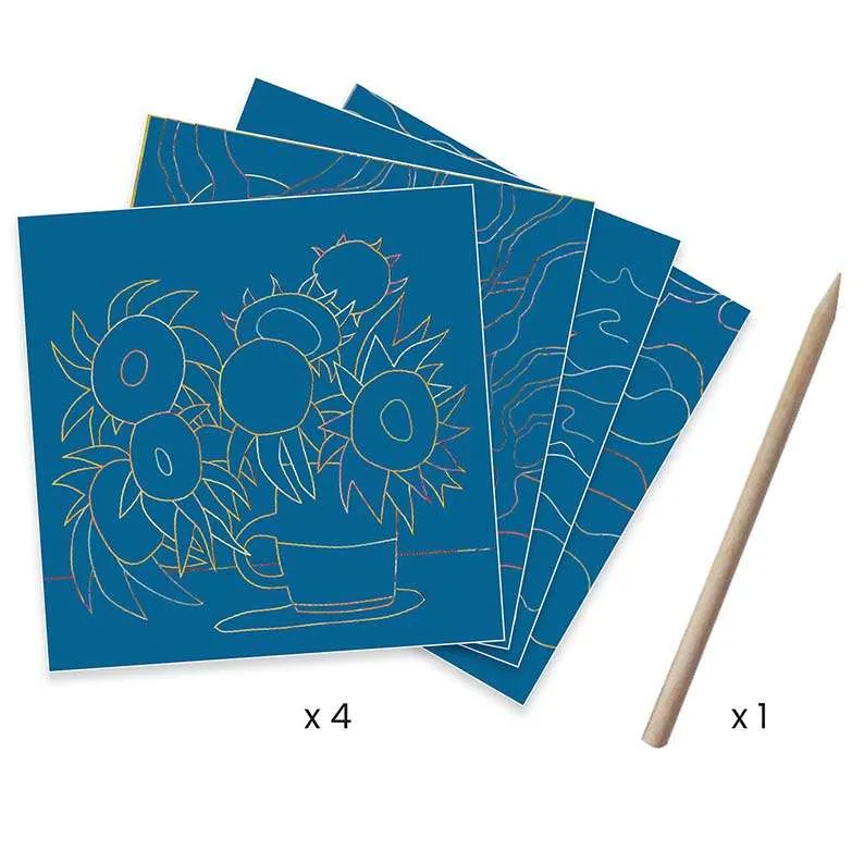 Ispirandosi a Van Gogh, Muriel Kerba propone di riprodurre alcuni motivi grattando la superficie di quattro quadretti per scoprire illustrazioni e dettagli dorati.