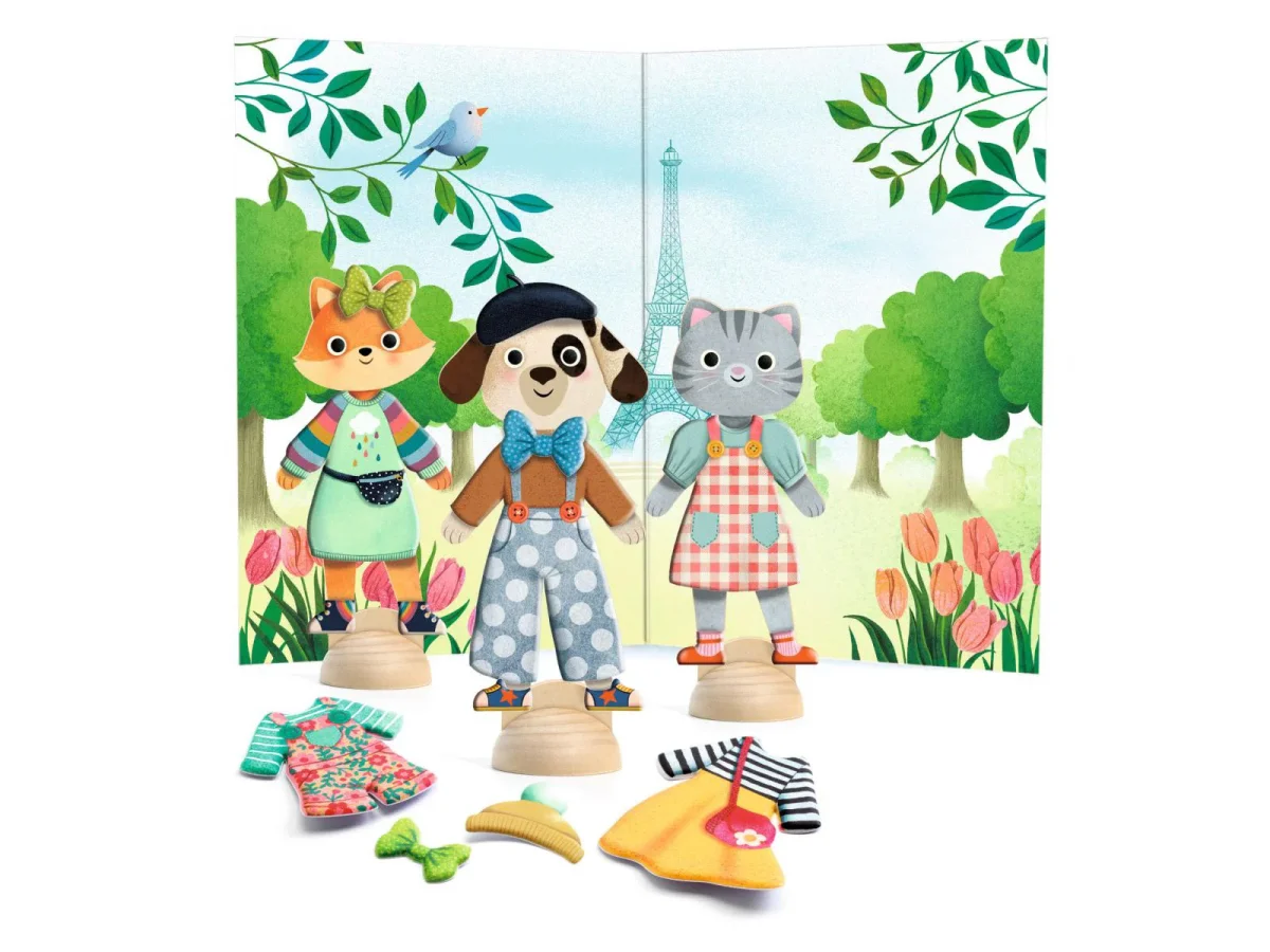Un’attività creativa che permette di divertirsi cambiando outfit a 3 adorabili animaletti in legno.