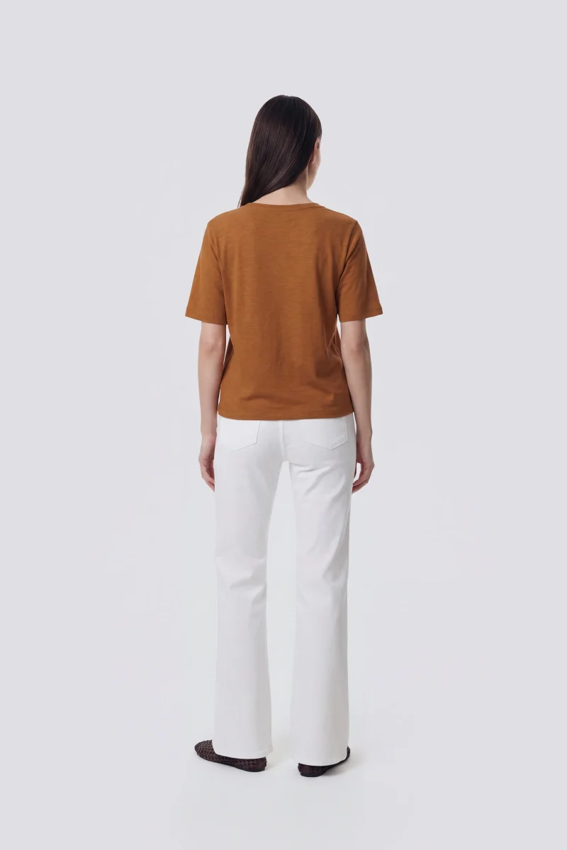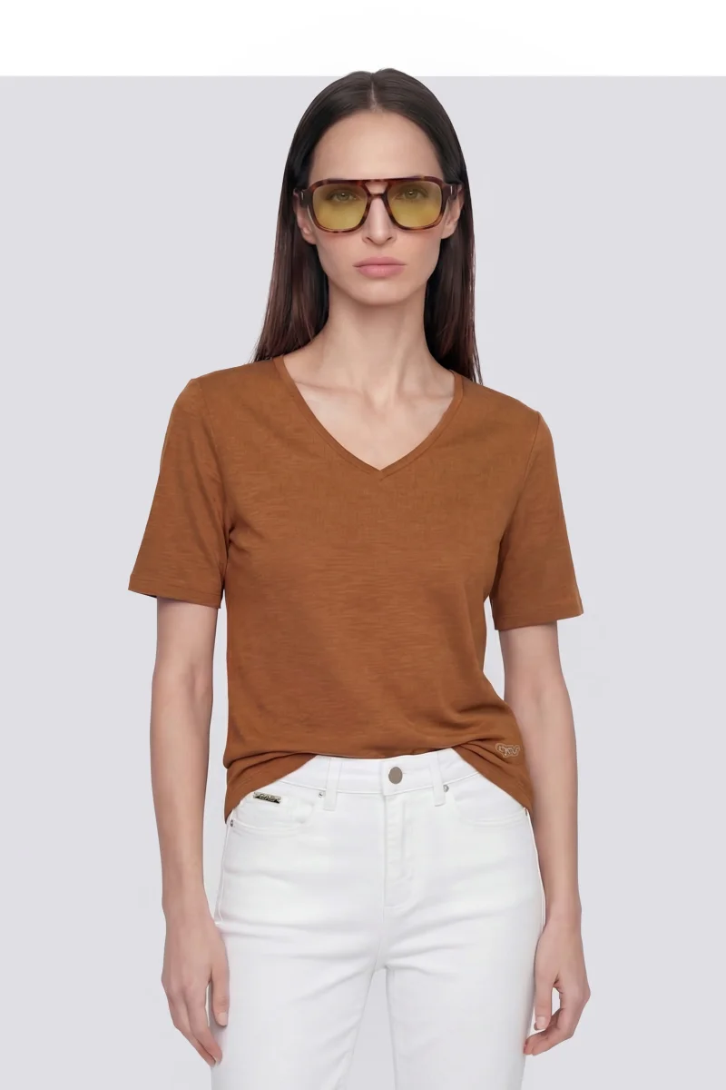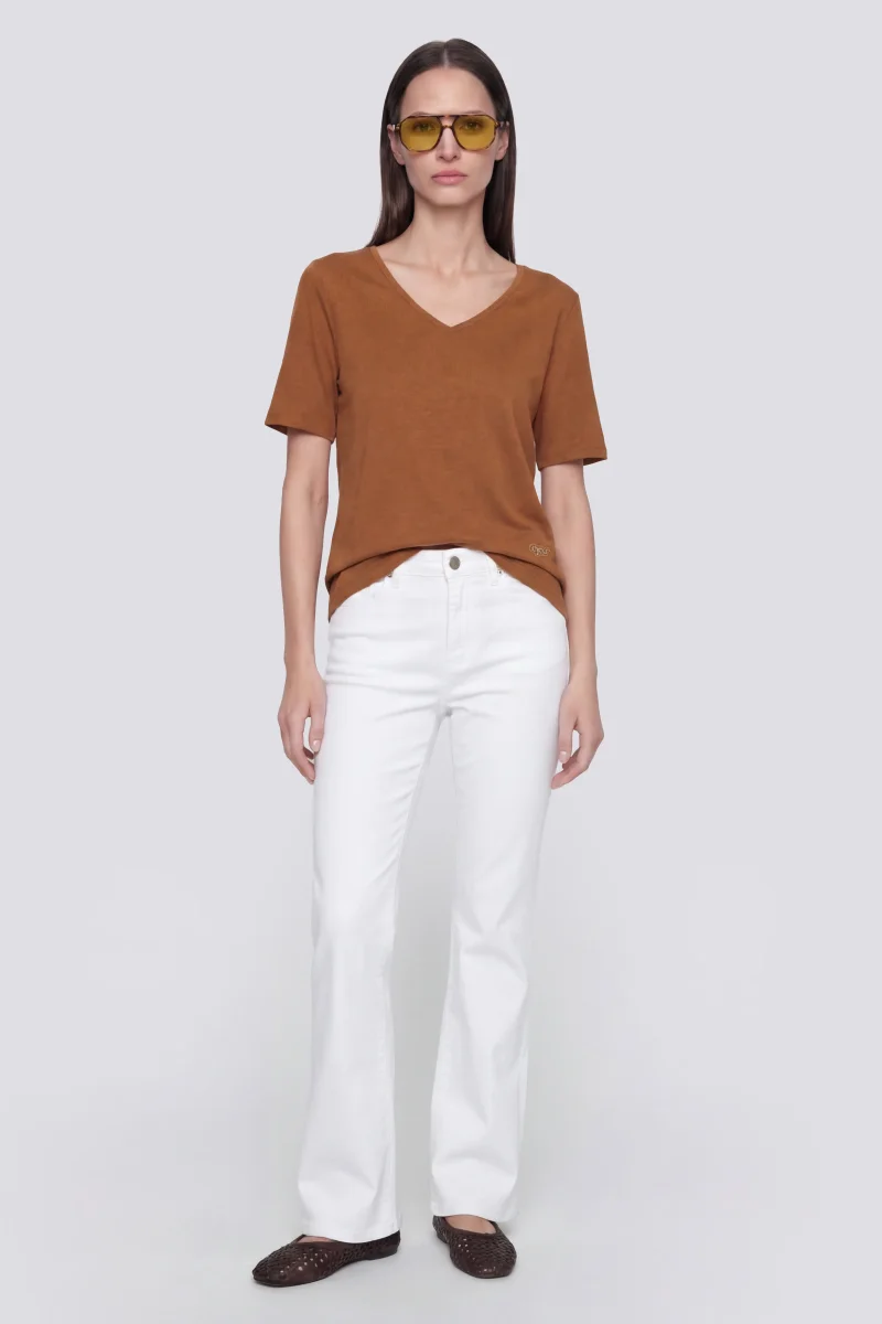 T-shirt donna a manica corta dal fit comfort, realizzata in jersey slub leggero cotone modal con scollo a V. Il patch logo con perline applicato sul fondo davanti sinistro aggiunge un dettaglio prezioso, rendendolo un elevated essential pensato per essere indossato ogni giorno.